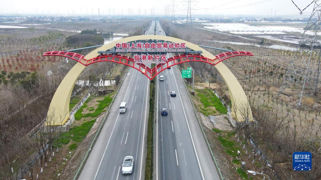 S2滬蘆高速上的中國(上海)自由貿(mào)易試驗區(qū)臨港新片區(qū)“海鷗門”(2月10日攝,無人機照片)。新華社記者 方喆 攝