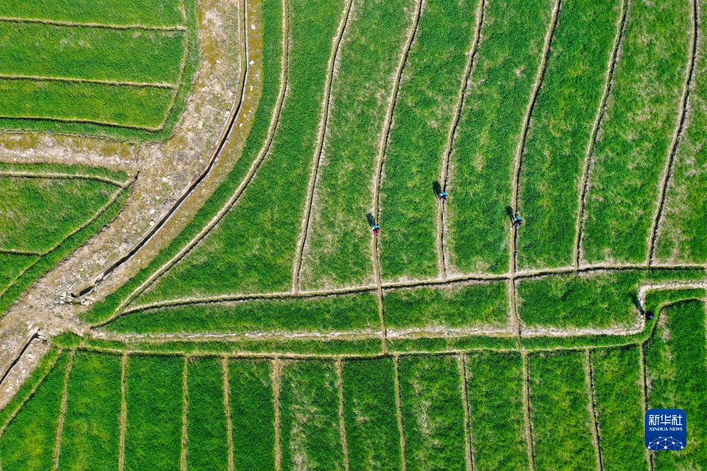 3月9日,浙江省寧波市鄞州區(qū)東吳鎮(zhèn)天童村村民在田間管護農(nóng)作物(無人機照片)。新華社發(fā)(胡學(xué)軍 攝)