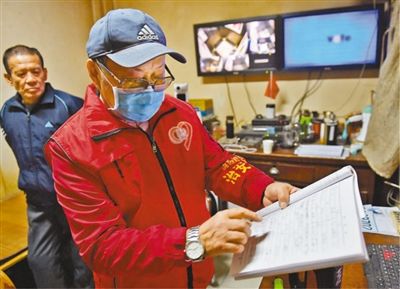 為改善社區治安狀況,陜西省西安市蓮湖區桃園路街道勞動一坊社區成立了一支由黨員和群眾組成的“螢火蟲”志愿巡邏隊,協助社區開展治安巡邏、糾紛調解等工作。圖為巡邏隊隊員在查看社區出入人員的登記信息。