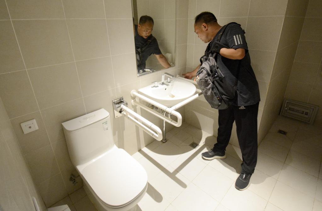 2021年7月15日,無障礙專家在北京延慶賽區(qū)冬奧村檢查室內(nèi)衛(wèi)生間無障礙設(shè)施。新華社記者 李欣 攝