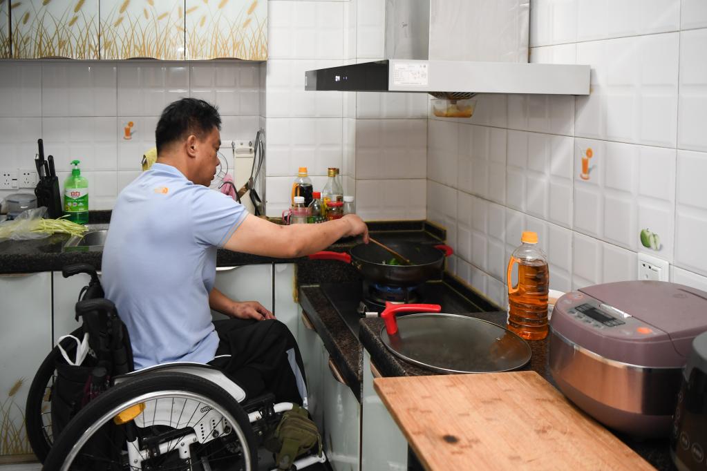 2021年8月25日,一位殘疾人在湖南省長沙市天心區(qū)家中的定制低位灶臺(tái)上炒菜。新華社記者 薛宇舸 攝