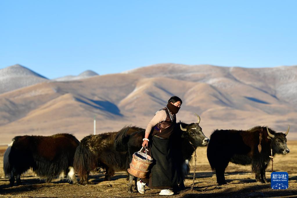 青海省玉樹藏族自治州稱多縣珍秦鎮二村牧民扎西德藏準備給牦牛擠奶(2020年10月28日攝)。新華社記者 張龍 攝