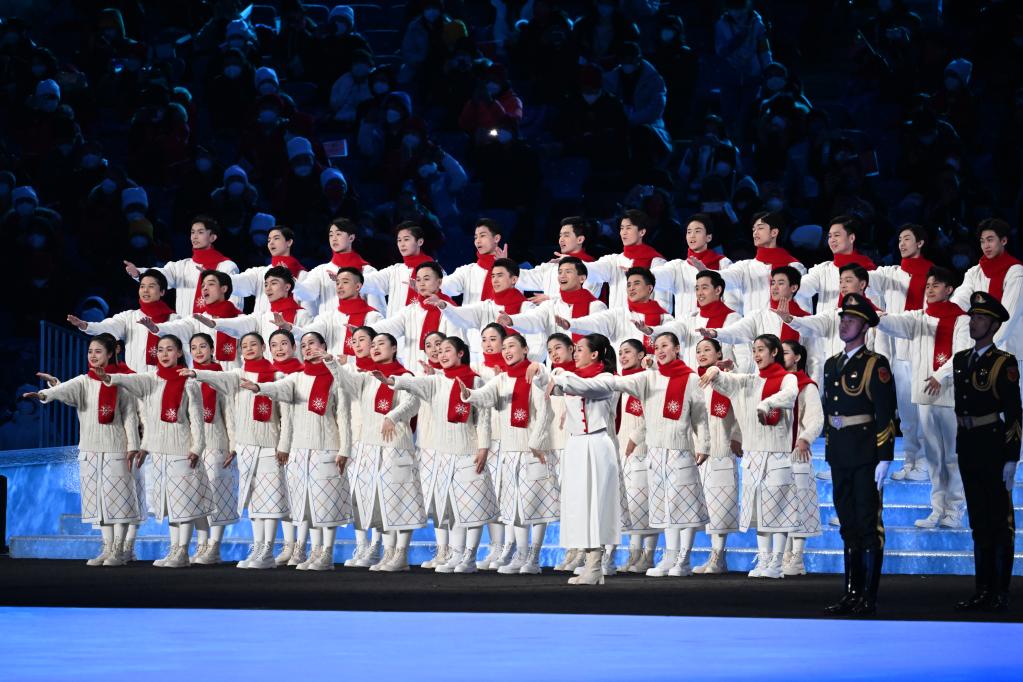 2022年3月4日晚,北京冬殘奧會開幕式上,中國殘疾人藝術團團長邰麗華帶領數十名殘疾人表演者用手語“唱”國歌。