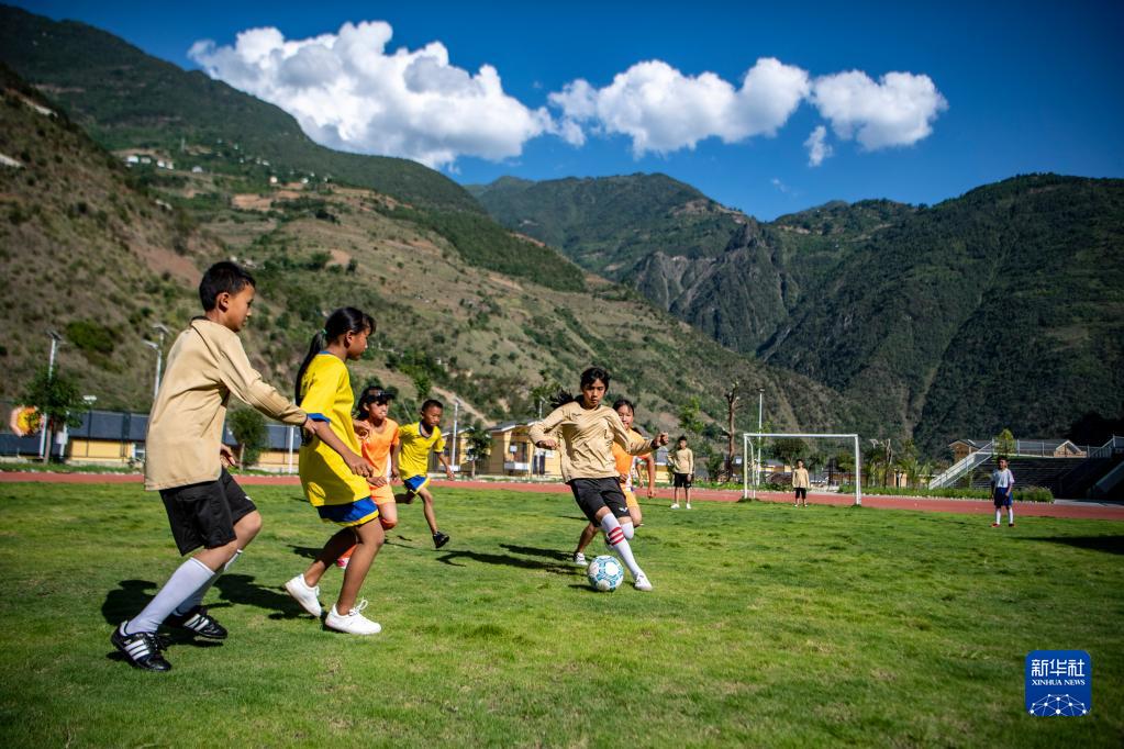 云南省怒江傈僳族自治州瀘水市大興地鎮格力小學學生在球場上踢足球(2020年5月18日攝)。新華社記者 江文耀 攝
