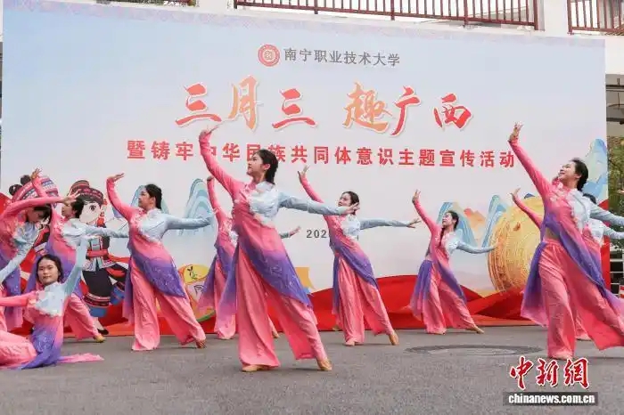 隨著農歷三月初三臨近,廣西處處洋溢著濃郁的“三月三”節日氛圍。連日來,唱山歌、拋繡球、竹竿舞、搶花炮、板鞋競速等獨具特色的民族體育項目和民俗活動在廣西各地輪番上演,吸引八方游客前來體驗。圖為南寧職業技術大學學生在表演民俗舞蹈。南寧職業技術大學 供圖