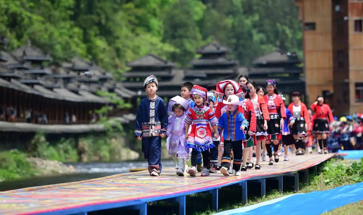 4月19日,在廣西桂林市龍勝各族自治縣龍脊鎮(zhèn)金江村黃洛瑤寨,小朋友身著民族服裝參加“T臺(tái)秀”。新華社發(fā)(潘志祥 攝)