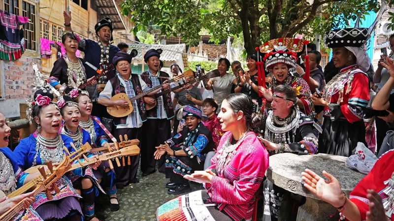 4月19日,在廣西桂林市龍勝各族自治縣龍脊鎮(zhèn)金江村黃洛瑤寨,當(dāng)?shù)厝罕姾屯鈬?guó)友人對(duì)山歌。新華社發(fā)(韋吉陽(yáng) 攝)