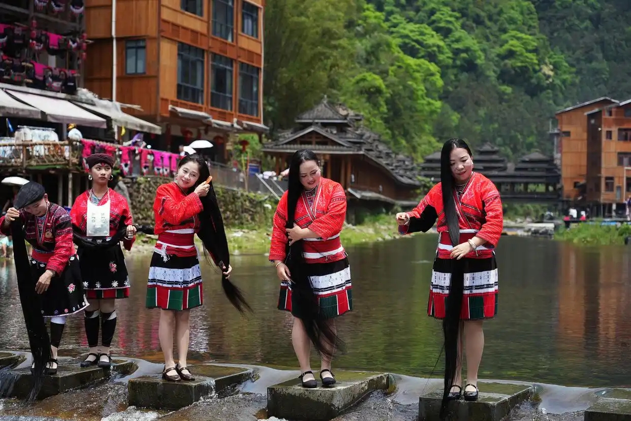 4月19日,在廣西桂林市龍勝各族自治縣龍脊鎮(zhèn)金江村黃洛瑤寨,瑤族婦女在河邊展示長(zhǎng)發(fā)梳妝。新華社發(fā)(潘志祥 攝)