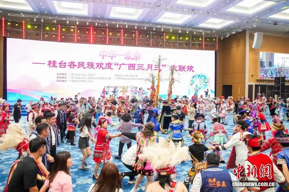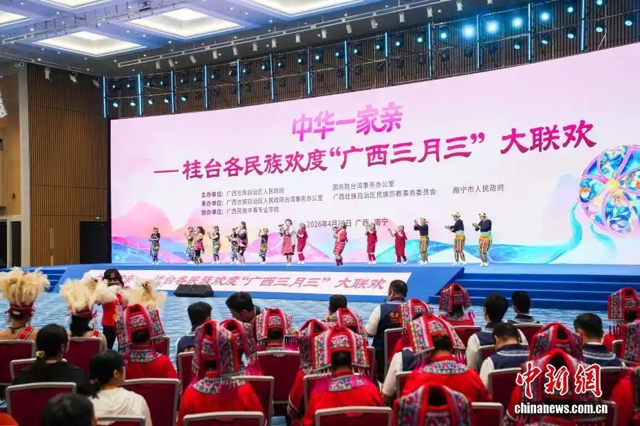 4月16日,中華一家親——2026桂臺各民族歡度“廣西三月三”大聯歡活動在廣西南寧舉行。本次活動由國務院臺灣事務辦公室和廣西壯族自治區人民政府共同主辦,500余名桂臺兩地同胞跨越山海,齊聚一堂,共敘兩岸親情,共話交流合作。圖為活動現場。中新社記者 陳冠言 攝
