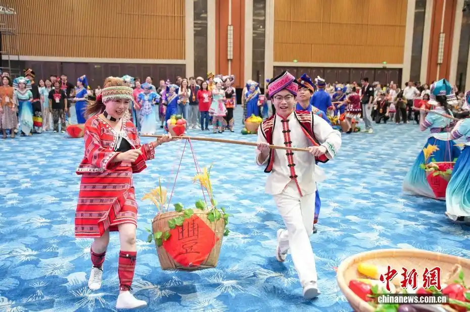 4月16日,中華一家親——2026桂臺各民族歡度“廣西三月三”大聯歡活動在廣西南寧舉行。本次活動由國務院臺灣事務辦公室和廣西壯族自治區人民政府共同主辦,500余名桂臺兩地同胞跨越山海,齊聚一堂,共敘兩岸親情,共話交流合作。圖為桂臺兩地同胞共同參與互動活動“把豐收帶回家(挑扁擔)”。中新社記者 陳冠言 攝