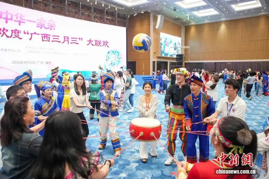 4月16日,中華一家親——2026桂臺各民族歡度“廣西三月三”大聯歡活動在廣西南寧舉行。本次活動由國務院臺灣事務辦公室和廣西壯族自治區人民政府共同主辦,500余名桂臺兩地同胞跨越山海,齊聚一堂,共敘兩岸親情,共話交流合作。圖為桂臺兩地同胞共同參與互動活動“把福氣帶回家(同心鼓)”。中新社記者 陳冠言 攝