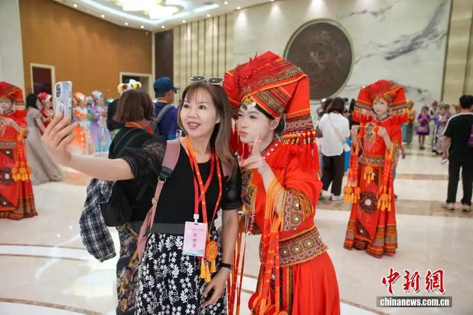 4月16日,中華一家親——2026桂臺各民族歡度“廣西三月三”大聯歡活動在廣西南寧舉行。本次活動由國務院臺灣事務辦公室和廣西壯族自治區人民政府共同主辦,500余名桂臺兩地同胞跨越山海,齊聚一堂,共敘兩岸親情,共話交流合作。圖為桂臺兩地同胞在活動現場自拍。中新社記者 陳冠言 攝