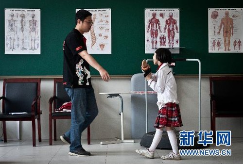 4月26日,在汶川地震中腿部受傷的康若琦在都江堰市友愛學校接受恢復訓練。