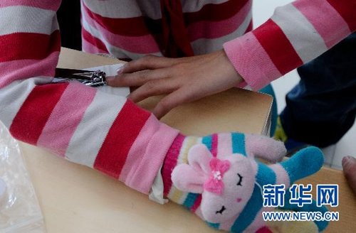 4月26日,在地震中失去右臂的夏鳳婷在學習借助殘肢的力量剪指甲。