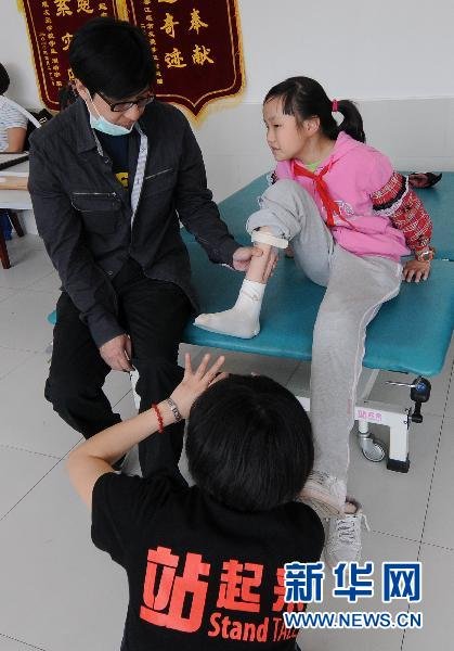 4月26日,在地震中腿部致殘的康若琦接受醫師的指導。