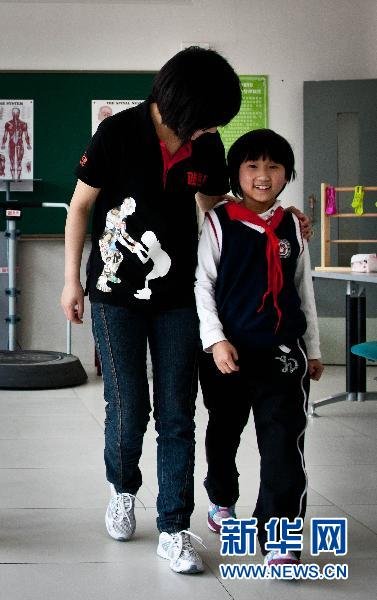 當日,在都江堰市友愛學校,川港康復中心和香港“站起來”組織的輔導老師為在三年前汶川地震中受傷比較嚴重的學生進行肢體康復訓練,以幫助他們能盡快恢復肢體力量和自理能力。都江堰友愛學校是“512”大地震后,由上海市人民政府援建的國內首個設施無障礙、殘健融合的九年義務教育學校。 新華社記者 鄭煥松