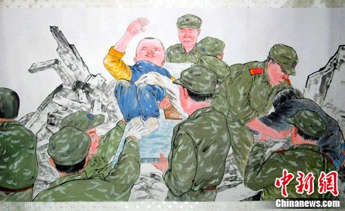 敬禮娃娃郎錚、芭蕾女孩李月、英勇的解放軍戰士、善良的白衣天使等在大地震中備受關注的人物,都被郭永潔用畫筆記錄在畫卷上,畫面最后則定格于救援人員抬著擔架爬坡的場景上。
