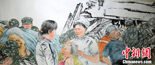 千鈞一發紅旗展,十萬男兒緊當先……汶川地震三周年,陜西青年畫家郭永潔以5·12汶川地震中備受關注的人物為素材,創作完成頌揚人民軍隊國畫《震起之豐碑》人物長卷,長達125米,涉及人物600多名。