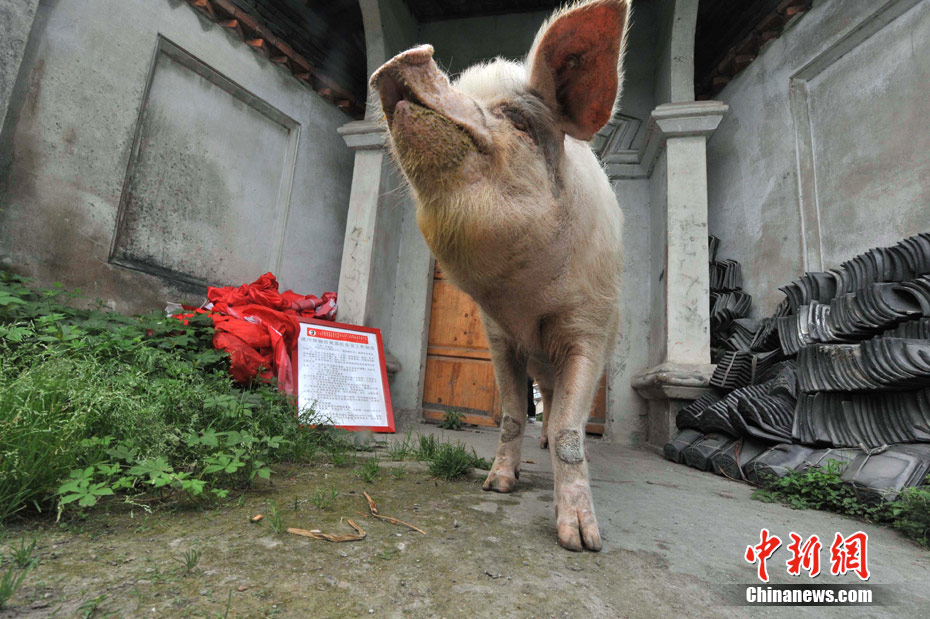 5月8日,四川省大邑建川博物館護(hù)養(yǎng)的“5.12汶川大地震”著名抗震動物豬堅(jiān)強(qiáng)正在專設(shè)的動物醫(yī)療所度過休養(yǎng)半年的病假生活之中。在三年前的大地震中,重災(zāi)區(qū)彭州市龍門山鎮(zhèn)團(tuán)山村村民萬興明家的一頭重達(dá)150公斤的大肥豬被埋在廢墟下,它憑借自身能量與啃吃黑木炭,于震后第36天被救出來時(shí),體重只有50多公斤,創(chuàng)造了一個生命奇跡。(賈國榮 攝)