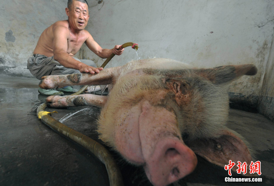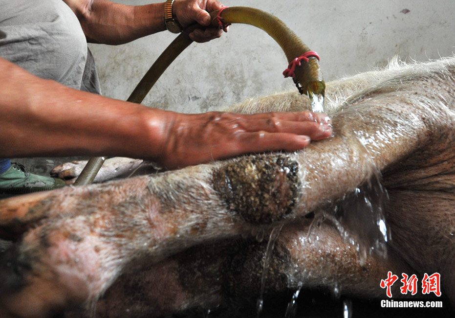 四川建川博物館館長樊建川特意將其收養(yǎng),取名豬堅(jiān)強(qiáng),請它在博物館由王福清專人照顧度過余生。現(xiàn)在豬堅(jiān)強(qiáng)已長到四百多斤重,每天散步減肥,準(zhǔn)備盡可能在“5.12汶川大地震”三周年紀(jì)念期間與民眾名人們見面。圖為豬堅(jiān)強(qiáng)洗澡潔身。(賈國榮 攝)