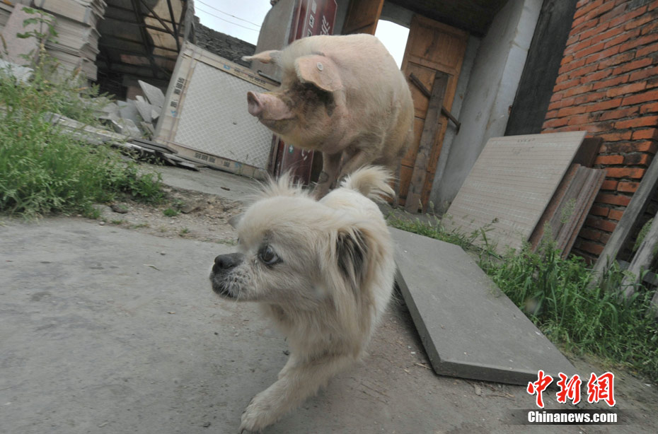5月8日,四川省大邑建川博物館護(hù)養(yǎng)的“5.12汶川大地震”著名抗震動物豬堅(jiān)強(qiáng),目前為腿部后遺傷病動過手術(shù)后,正在專設(shè)的動物醫(yī)療所度過休養(yǎng)半年的病假生活之中。圖為豬堅(jiān)強(qiáng)和小狗作伴。(賈國榮 攝)