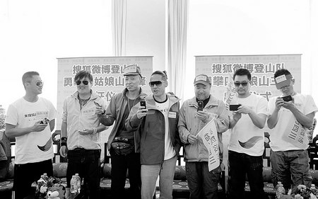 登山隊(duì)成員出發(fā)之前,已經(jīng)迫不及待地開(kāi)始用手機(jī)"直播"