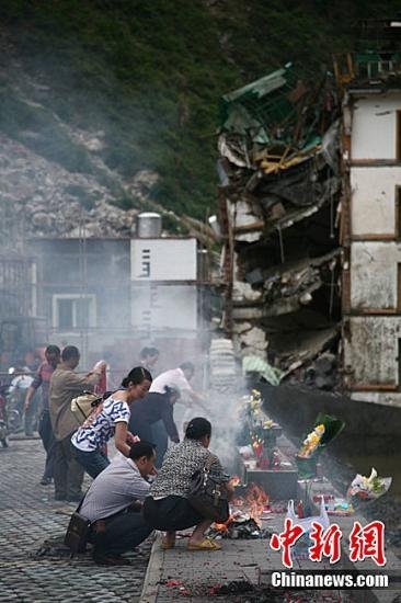 5月10日,離“5.12”汶川特大地震三周年紀(jì)念日還有2天,四川北川地區(qū)民眾紛紛趕回老縣城遺址敬獻(xiàn)鮮花、燒紙錢祭拜遇難親人。(中新社發(fā) 張浪 攝)