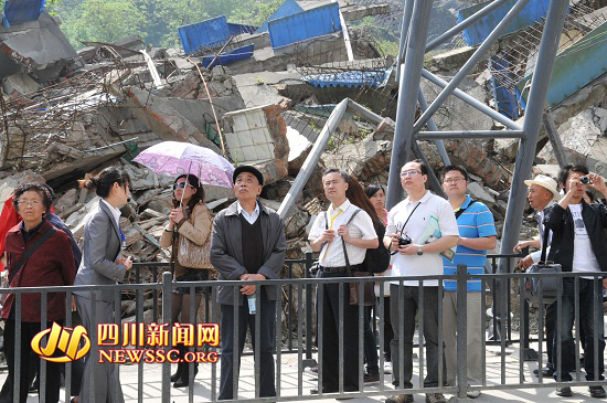 上午9點30分,網絡媒體記者、編輯走進老北川地震遺址。“5.12”地震災害后,北川老縣城被作為地震遺址保留了下來,這里也成為憑吊北川地震逝者的重要地點。看著街道兩邊傾倒的樓房、破碎的門窗,聽著講解員講述殘瓦斷壁間的故事,網媒記者們表情凝重,地震造成的傷害再一次敲擊著每一位考察團成員的心。