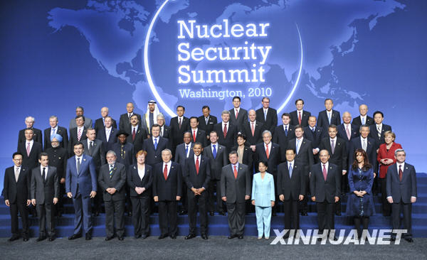 4月13日,中國國家主席胡錦濤在華盛頓會議中心出席核安全峰會時和與會領導人合影。新華社記者 李學仁 攝