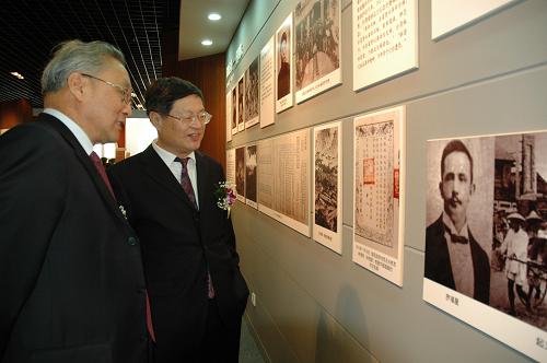 5月6日,霧峰林家后人林為民(右)為海峽兩岸關系協會副會長張銘清介紹五桂樓內展出的史料。北京首條臺灣文化主題商業街即將揭開面紗,其標志建筑五桂樓5月6日率先揭牌。北京五桂樓仿建臺中縣霧峰鄉林家花園標志性建筑五桂樓,建筑面積約3500平方米,將成為展示史料、舉行兩岸交流活動及重要宴會的場所。 新華社記者任沁沁攝