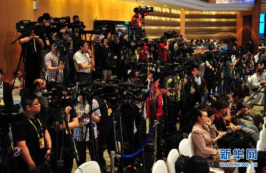 4月10日,媒體記者在開(kāi)幕式現(xiàn)場(chǎng)拍攝。當(dāng)日,博鰲亞洲論壇2014年年會(huì)在海南省博鰲開(kāi)幕。 新華社記者 郭程 攝