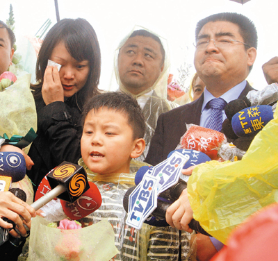 陳光標(右)上午到金山鄧麗君墓園追悼,全家高唱鄧麗君歌曲,表情哀戚。 來源:臺灣《聯合晚報》