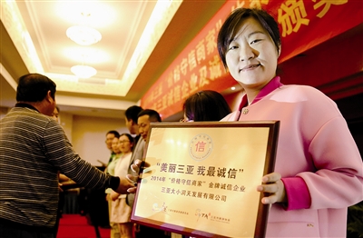 一企業代表在展示剛領取的“美麗三亞,我最誠信”獎牌。