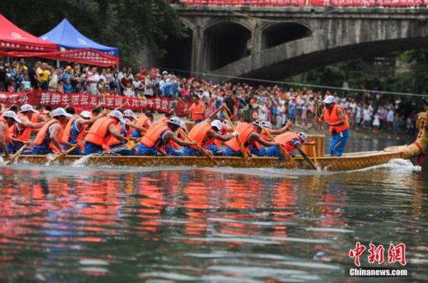 2016年6月9日,農歷五月初五端午節,極具中華傳統文化魅力的賽龍舟在貴州省岑鞏縣龍田鎮舉行,共度端午節。中新社記者賀俊怡攝
