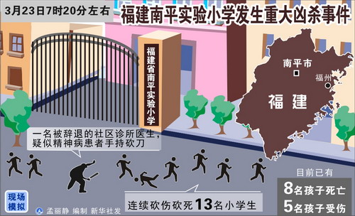 23日7時20分左右,正逢孩子們上學(xué)時間,福建省南平市實(shí)驗(yàn)小學(xué)門口,一名中年男子手持砍刀行兇,釀成13名小學(xué)生8死5傷的慘劇!斑@真是飛來橫禍!”——南平市實(shí)驗(yàn)小學(xué)慘案中一位受傷學(xué)生家長痛呼,她希望加強(qiáng)校園周邊治安管理,不要讓無辜的孩子再受到傷害。