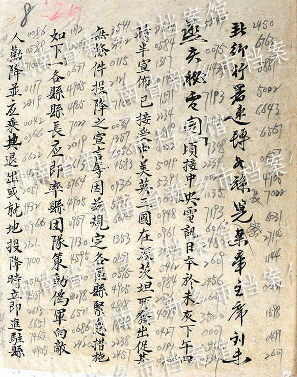 圖為1945年,河南新鄉(xiāng)關(guān)于日本投降后指示各區(qū)縣部署緊急措施電報(bào)稿。【央視網(wǎng)據(jù)中央檔案館資料】