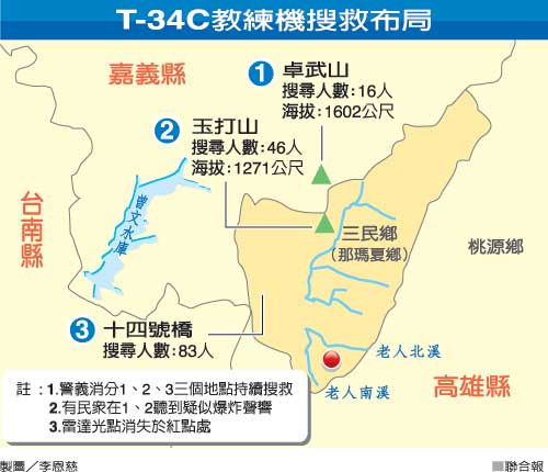 根據(jù)岡山空軍官校塔臺(tái)雷達(dá)光點(diǎn)位置,臺(tái)空軍分析教練機(jī)可能在高雄縣那瑪夏鄉(xiāng)山區(qū)出事,臺(tái)軍陸軍第八軍團(tuán)和高雄縣政府消防局火速出動(dòng)救難人員上山。昨日下午4時(shí),由臺(tái)軍警及義消組成的搜救隊(duì)在高雄縣三民消防分隊(duì)集結(jié)。