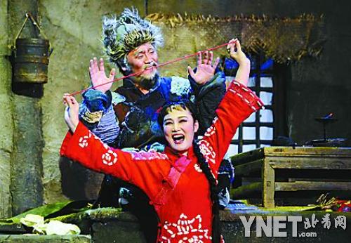 昨晚來到人民大會堂的觀眾,許多已滿頭白發,他們對歌劇《白毛女》有一種懷舊情結,也有一批來自北京四所大學的學生,他們則以仰慕的心情看待這部經典。當《北風吹》的旋律響起,尤泓斐扮演的喜兒以甜美的歌聲唱出觀眾最熟悉的旋律時,觀眾漸漸進入了戲劇的情緒,楊白勞與喜兒父女的遭遇吸引著觀眾的視線。雖然在演唱《扎紅頭繩》時,尤泓斐將第一段誤唱成第二段,引起了觀眾一陣議論,然而在后來的演出中,扮演楊白勞的孫礫和扮演喜兒的尤泓斐的激情演繹,將觀眾的注意力又吸引到戲劇發展的情境中。