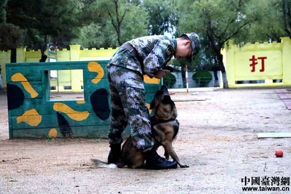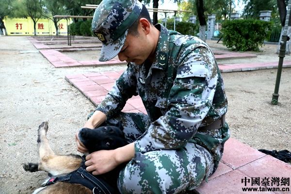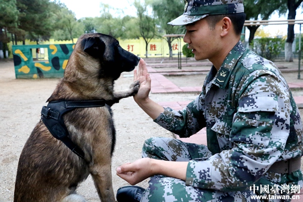 北部戰區陸軍某邊防旅“黑河好八連”軍犬訓導員付平和他的軍犬“泰格”。(中國臺灣網 尹賽楠 攝)