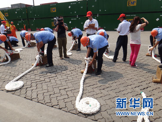 8月1日,青島港職工在表演絕活“八股尼龍纜插琵琶頭”。新華網 記者 李志強 攝