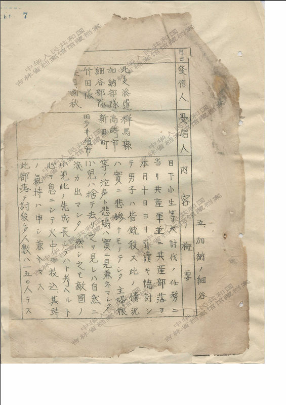 此檔案是昭和十五年(1940年)九月太田藤太郎寫給國內親人的信件。記載了因隨信寄送慘殺照片7張,照片上寫著“用軍刀刺殺”場面的字樣,對信件做出了處置。