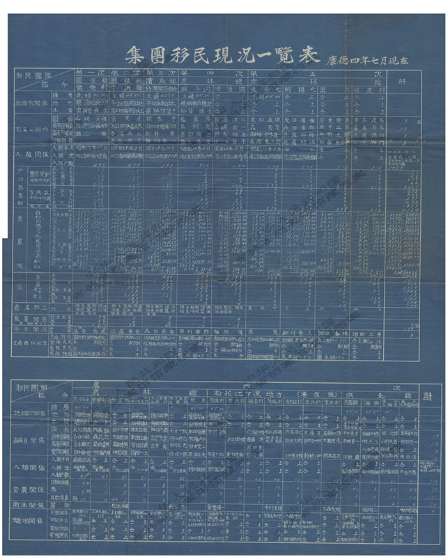 此檔案是三站圖表,記載了從1932年10月第一次武裝移民團開始,日本先后進行的6次“集團移民”情況。其中一份全面反映了從第一次到第六次日本“集團移民”的分布、數量、現狀等(其中包括彌榮村、千鎮村等移民的地理位置、指導員關系、入殖關系、營農關系、農產加工、戶數、教育、衛生、交通等方面都做了較詳盡的統計);一份為各移住地的作物面積、人口、收量、家畜的增加圖表;另有一份是“龍爪移民團”昭和十三年(1938年)所在村名及作物情況一覽表。