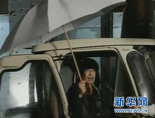 卡扎菲來(lái)到利比亞國(guó)家電視臺(tái)的視頻截圖照片。新華社\路透社