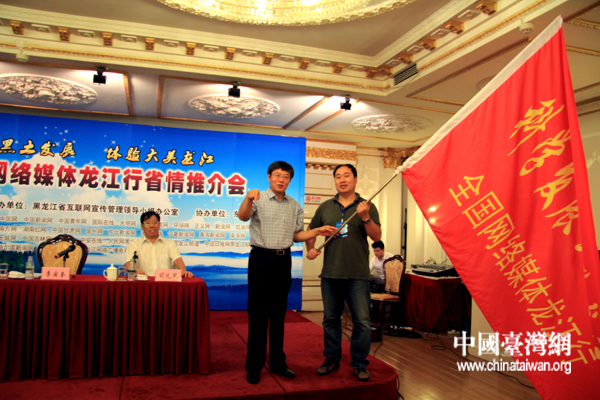 黑龍江省委宣傳部副部長(zhǎng)李寅奎(左)向采訪團(tuán)代表授旗(中國(guó)臺(tái)灣網(wǎng) 李徽 攝)