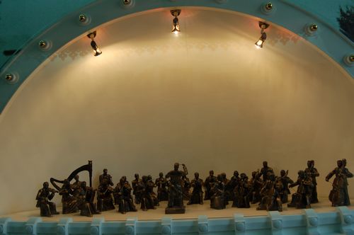 在展覽中記者看到一組泥人張制作的泥塑,雕塑了一個樂團正在演奏。講解人員介紹,這是在第一屆哈爾濱之夏開辦的貝殼劇場里的演奏。當時一些猶太音樂家、戲劇家相繼來到哈爾濱僑居或演出。他們以南崗鐵路俱樂部為主要演出舞臺,把西方藝術精粹展現在他們視為第二故鄉的哈爾濱,既豐富了哈爾濱人的藝術生活,也培養出許多本地的音樂與戲劇人才。