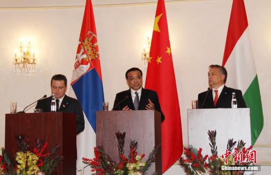 11月25日晚,中國國務院總理李克強在羅馬尼亞首都布加勒斯特與塞爾維亞、匈牙利總理共同會見記者。中新社發 沈晨 攝