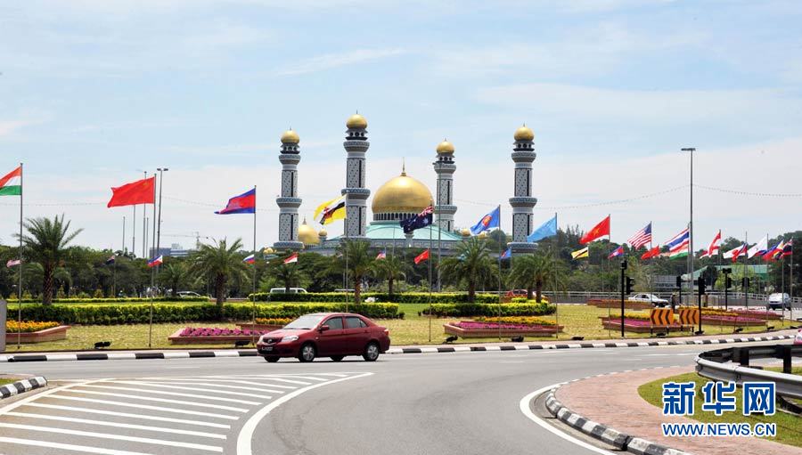 2013年10月7日 (國際)文萊準備迎接第23屆東盟峰會及系列峰會 10月6日,文萊首都斯里巴加灣市街道兩邊懸掛著東盟及對話伙伴國的旗幟。第23屆東盟峰會及系列峰會將于10月9日至10日在文萊首都斯里巴加灣市舉行。新華社發(杰弗里攝)