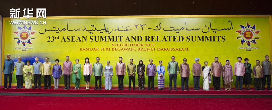 10月9日,中國國務院總理李克強在文萊斯里巴加灣市出席文萊蘇丹哈桑納爾為出席東亞峰會的領導人舉行的歡迎宴會。這是與會領導人等在宴會前身著民族服裝合影。新華社記者黃敬文攝
