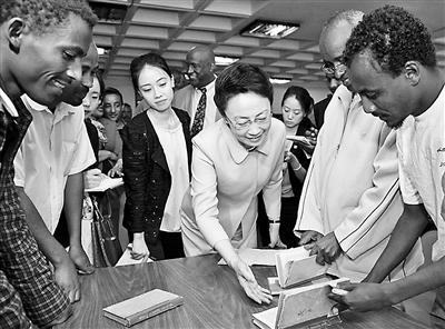 李克強(qiáng)總理夫人程虹5日在埃塞俄比亞總理夫人羅曼·塔斯法耶的陪同下參觀了亞的斯亞貝巴大學(xué),觀摩漢語授課,與學(xué)生們交流,觀看學(xué)生們的中國文化才藝展示,還捐贈了書籍、計算機(jī)等物品。程虹說,你們是文化的紐帶,感謝你們對中國人民的情誼。你們對中國文化的熱愛感動了我,也會感動中國人民。