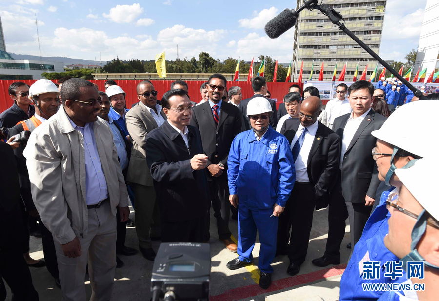 5月5日,中國國務(wù)院總理李克強(qiáng)考察亞的斯亞貝巴輕軌項目,埃塞俄比亞總理海爾馬里亞姆陪同。這是李克強(qiáng)與海爾馬里亞姆看望施工人員。新華社記者李學(xué)仁攝